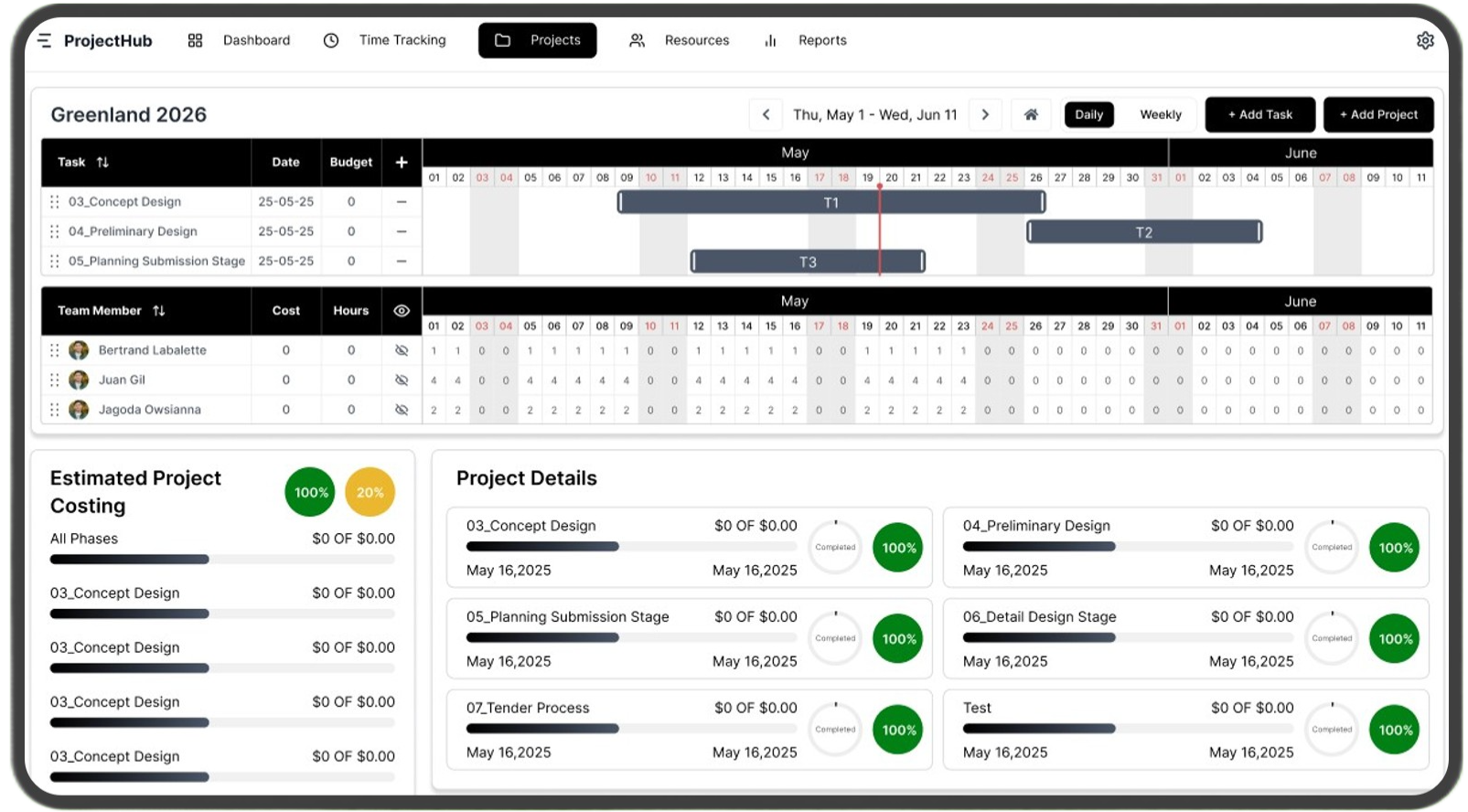 Create your stages, assign your team and hours, and see how everything aligns.