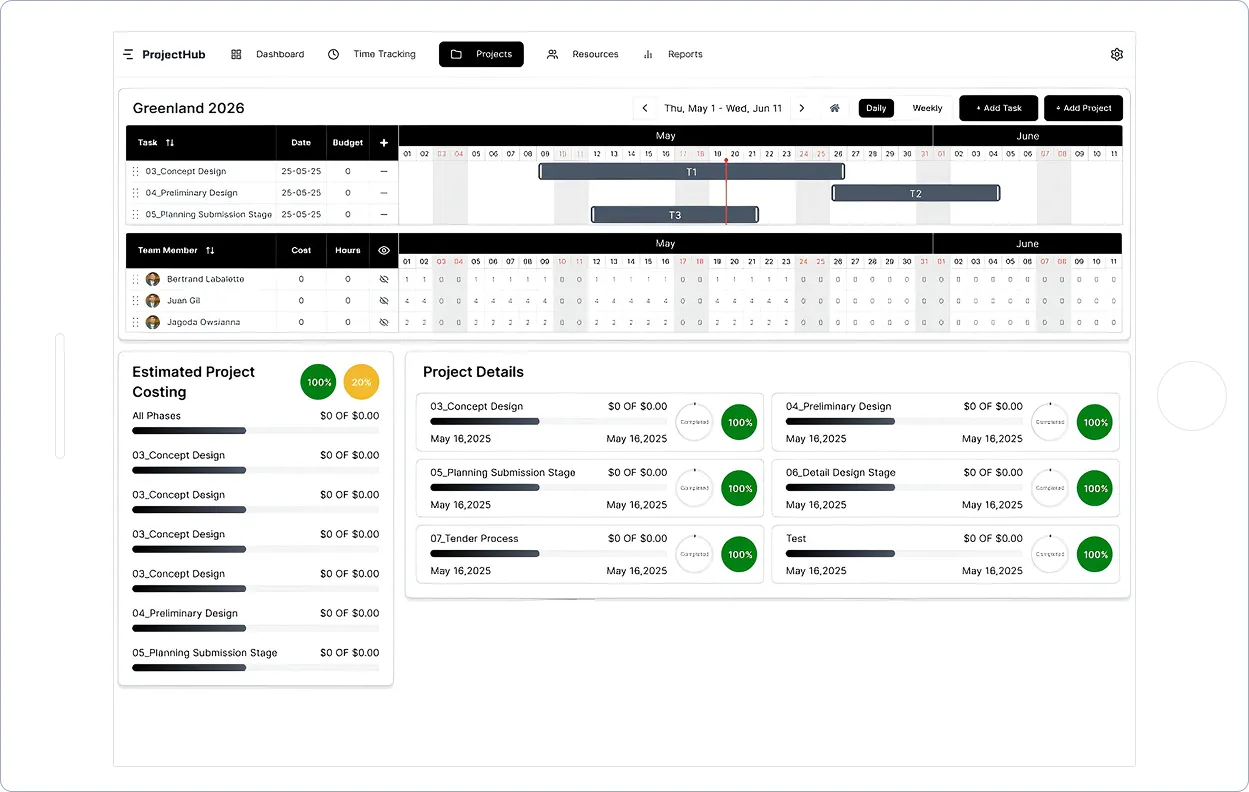 Create your stages, assign your team and hours, and see how everything aligns.